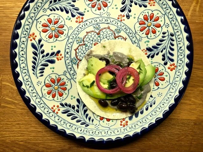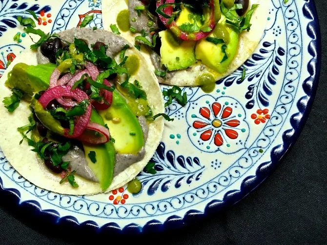 Place a nice dollop of black bean hummus onto each tortilla, about a tablespoon. Smudge over the tortilla. Top with 2 slices of avocado, some dressed beans, pickled onion and habanero sauce or a chili sauce of your choice.