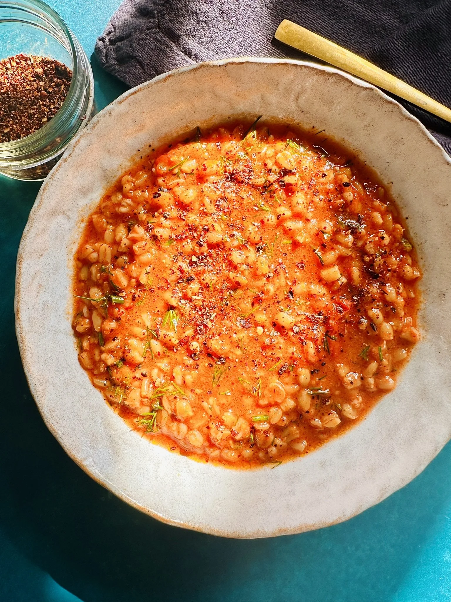 This dish isn’t dissimilar to an Italian farro soup, but a more risotto level of thickness. My version came about because I had some leftover confit tomato and some leftover cooked spelt and it seemed like it would be a match made in heaven. I ended up adding the pureed peppers for more body and sweetness. It’s a really delicious dish, with just a few ingredients, but using good quality olive oil will make this dish shine. I like Honest Toil. The total cooking time is quite long but there’s little prep, just a little preplanning require.