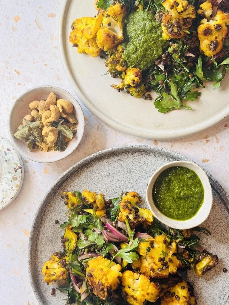 ROAST CAULIFLOWER & LENTIL SALAD WITH CORIANDER CHUTNEY