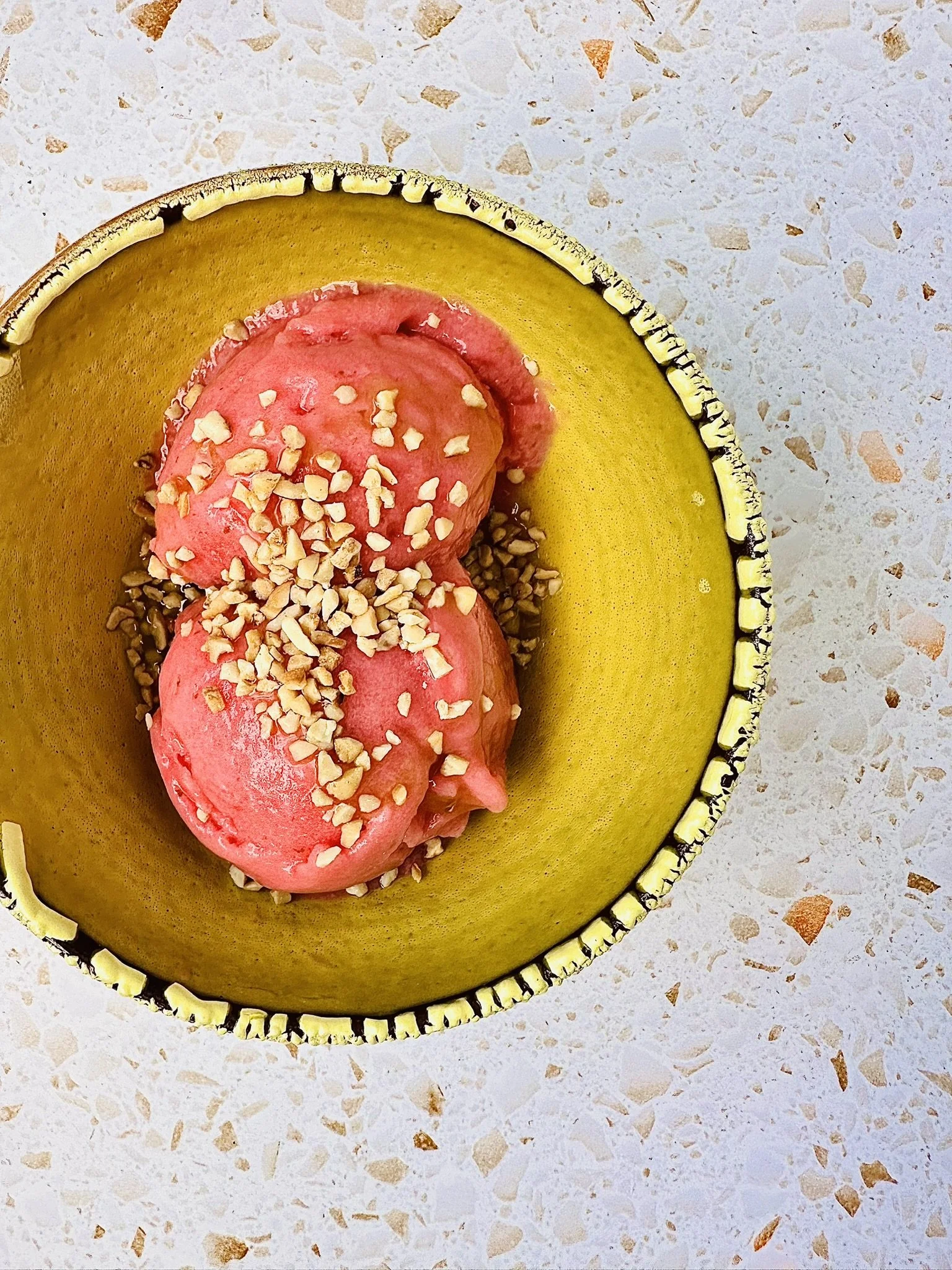 Rhubarb offers a welcome burst of brightness in the fruit world in colder months, and I’m always excited when it comes into season. It’s finally starting to feel like sorbet season too and this offers a refreshing way to enjoy the season. Lovely at the end of a meal. If you fancy adding a splash of gin to this I can confirm it would be a welcome addition, but it’s delicious as well as it is.